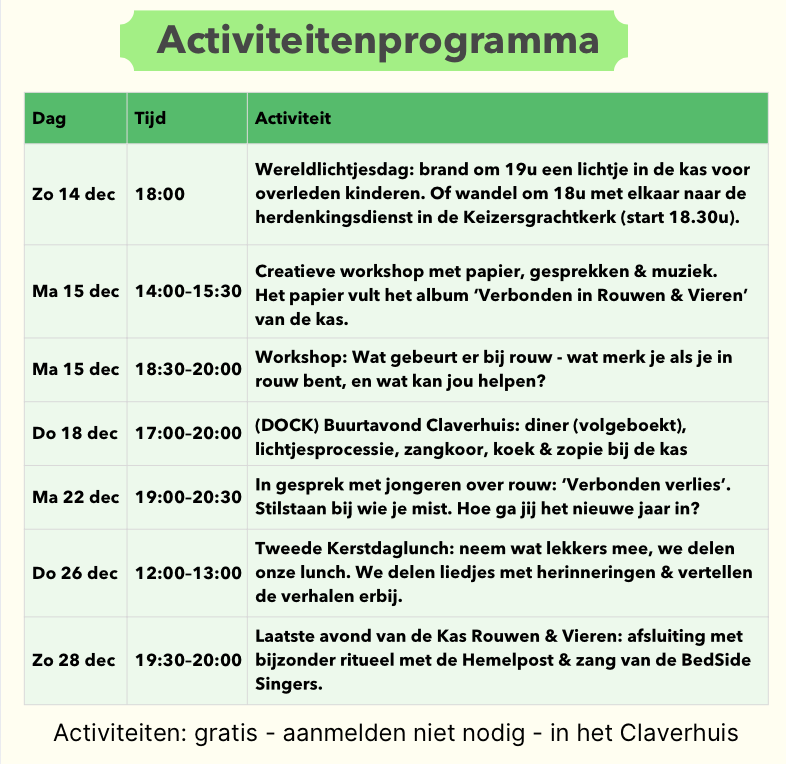 De periode van de openstelling wordt gestart met de opening en ook weer passend afgesloten. Gedurende de openstelling van de kas worden er bijzondere activiteiten georganiseerd in het thema kerst, rouw, troost en vieren.