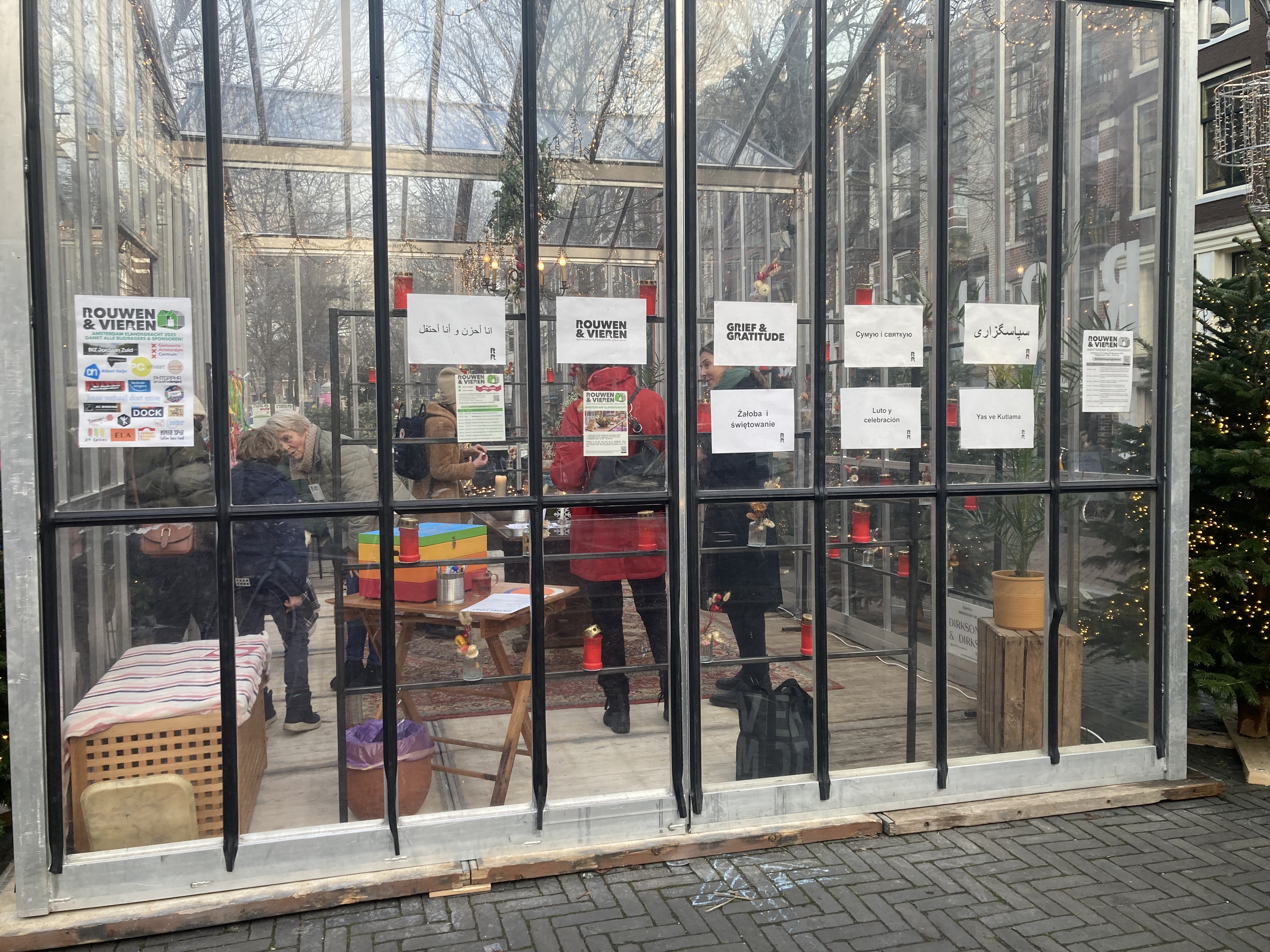 Rouw is vaak onzichtbaar in ons dagelijks leven. In de decemberperiode kan dit extra confronterend zijn voor mensen. Op de Elandsgracht in Amsterdam komt een glazen kas ‘Rouwen & Vieren’ die ruimte maakt voor verlies en herinnering. Je kunt een kaarsje branden, iets opschrijven of in gesprek gaan.