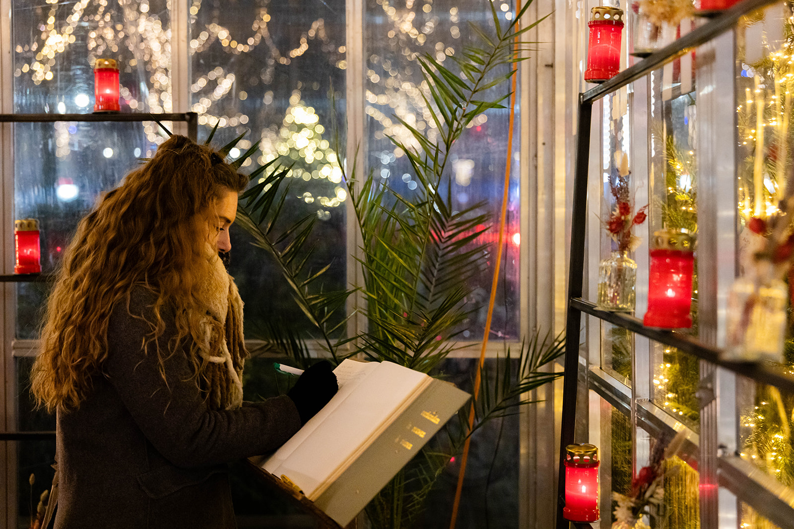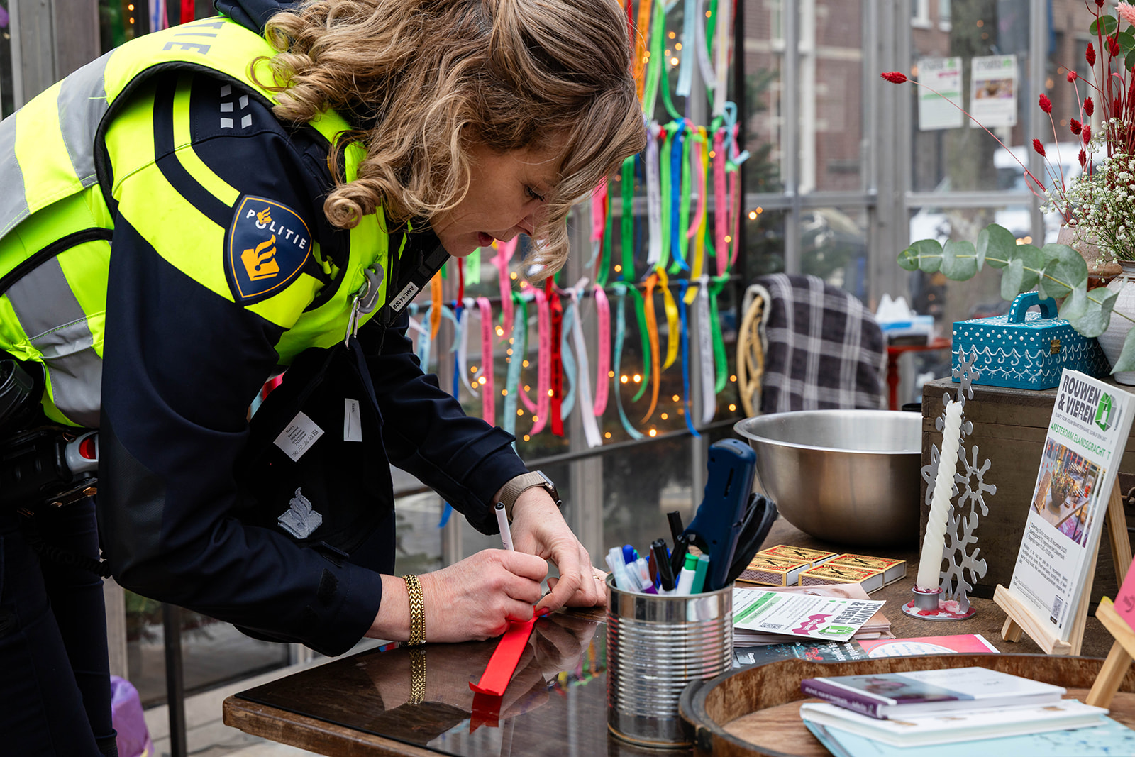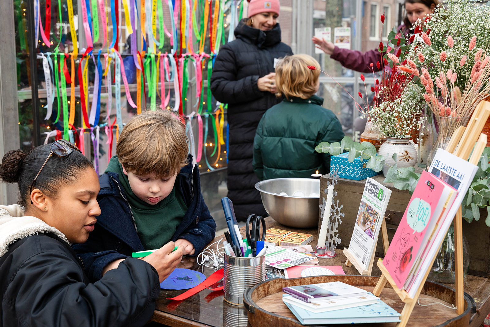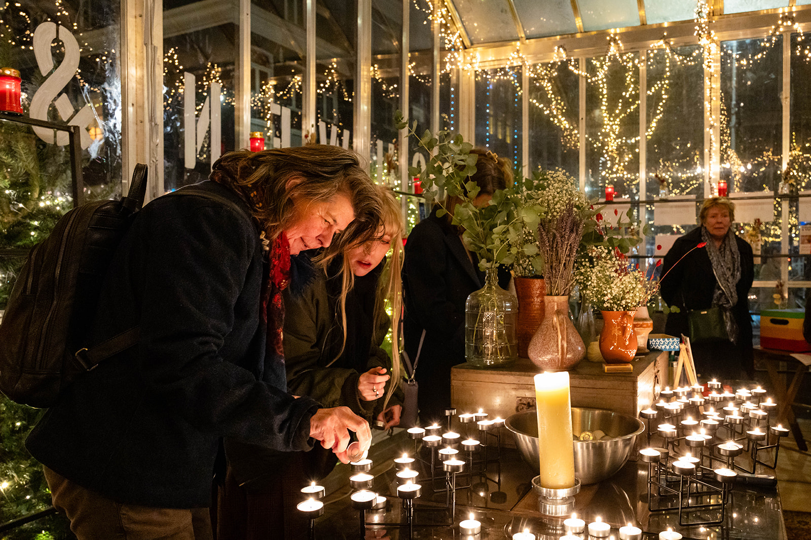 Bezoekers wegwijs maken bij de mogelijkheden in de kas: aansteken kaarsje, beschrijven lint, praatje maken.